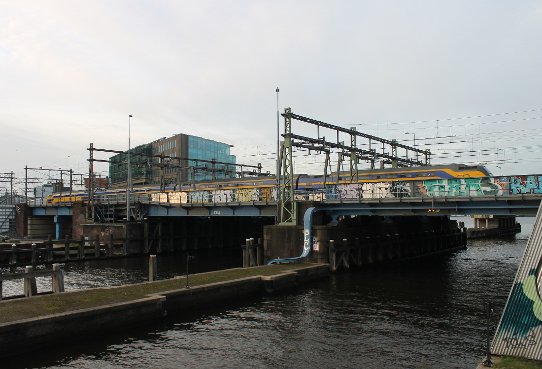 Twee maal drie naast elkaar gelegen bruggen met elk twee sporen: drie beweegbare bruggen (basculebruggen, 20 m) en drie vaste (17 m). Plus een brugwachtershuisje. De bruggen zijn gebouwd op de werf van de NDM in Noord.
