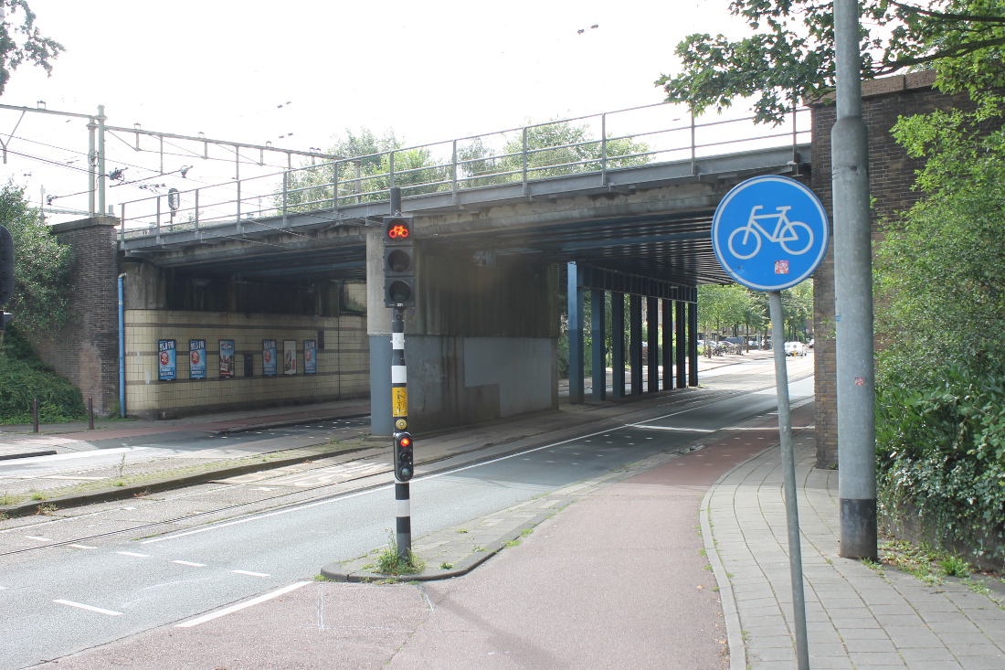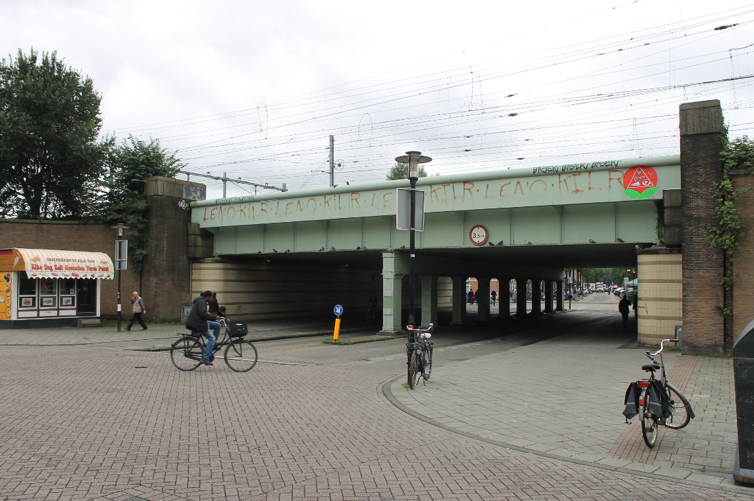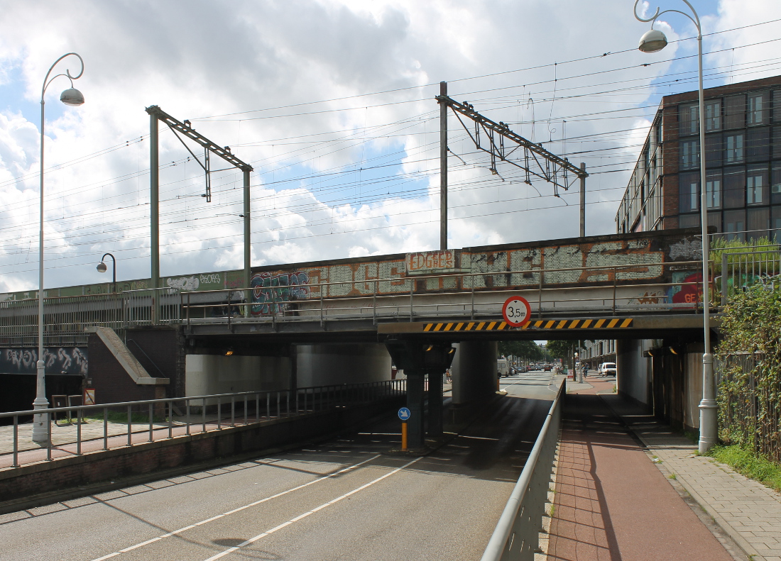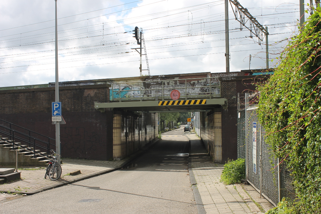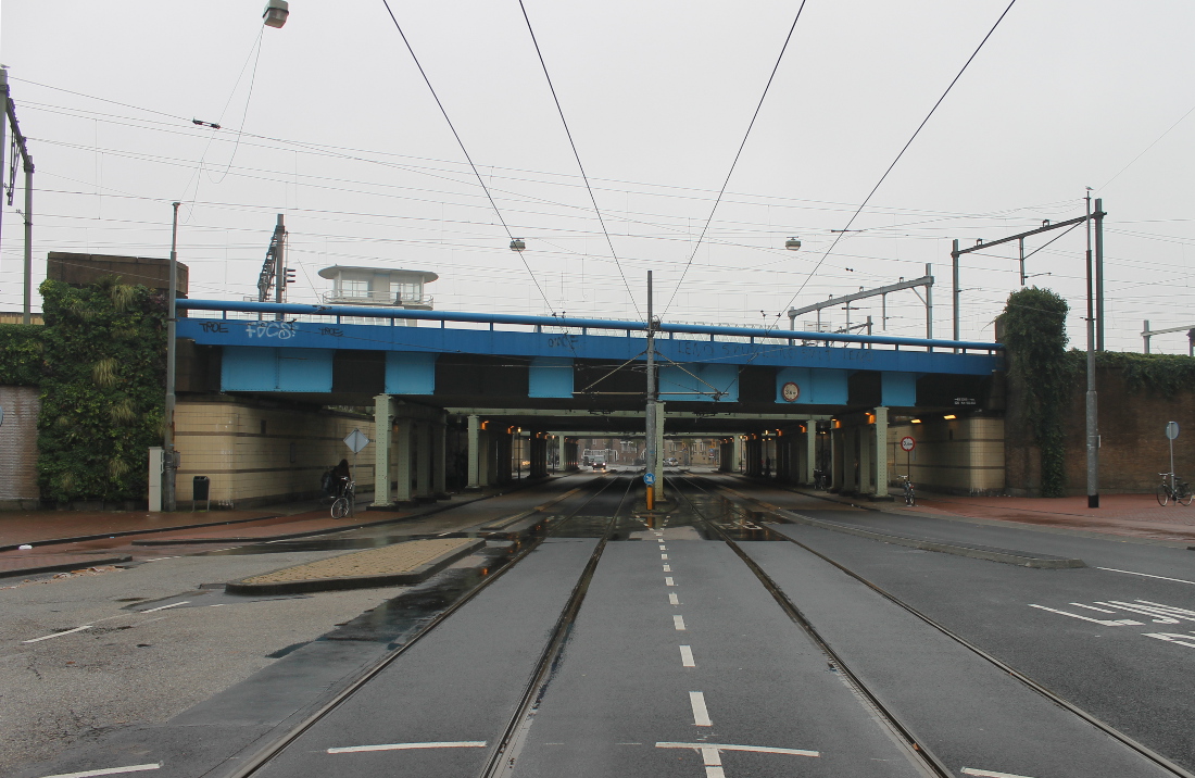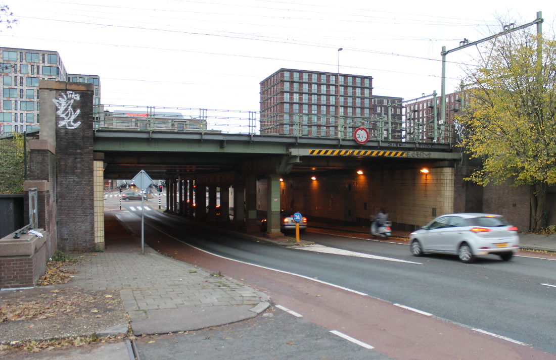 De eerste onderdoorgang in Oost op deze route. Hier was al sinds 1901 een viaduct, waar een tram doorheen kon naar de Indische Buurt. Het oude viaduct werd voor de Spoorwegwerken Oost vervangen door een nieuw met twee doorgangen van elk krap 10 meter. Waar nu de lelijke betonnen pijler is, waren oorspronkelijk stalen kolommen.