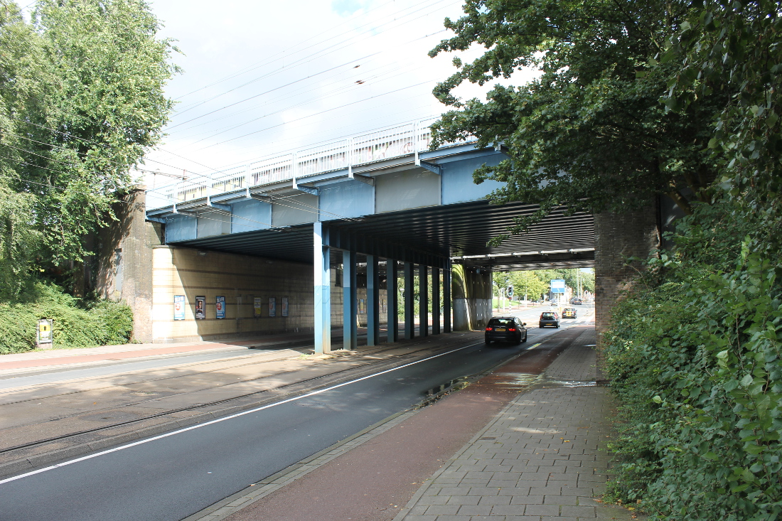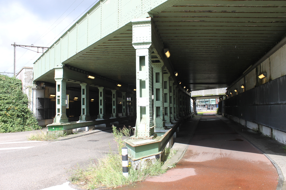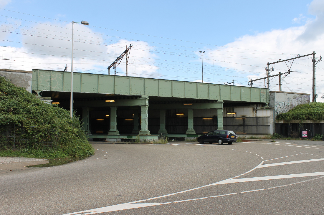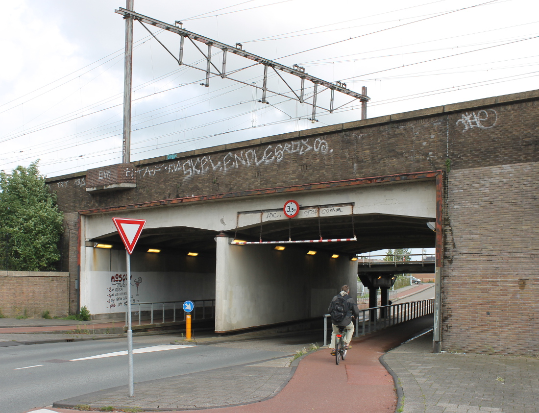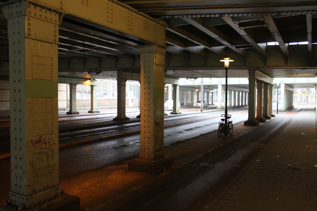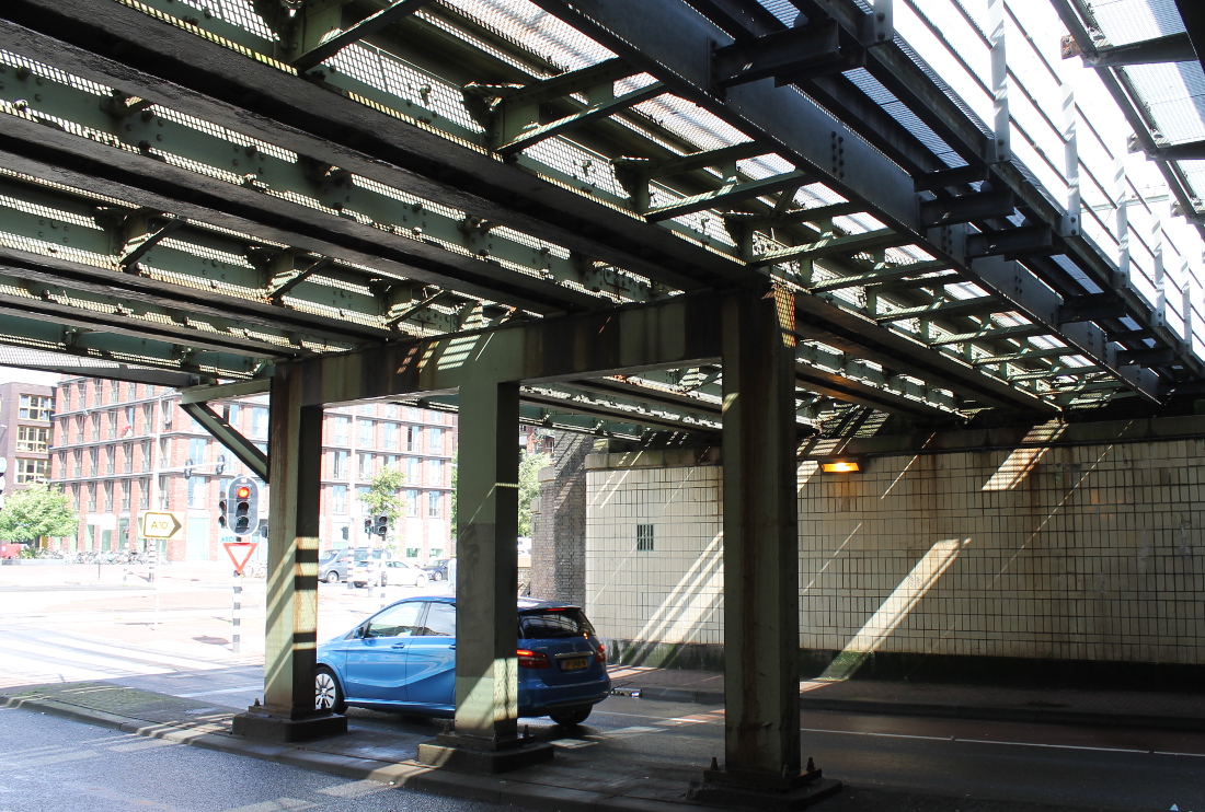 De eerste onderdoorgang in Oost op deze route. Hier was al sinds 1901 een viaduct, waar een tram doorheen kon naar de Indische Buurt. Het oude viaduct werd voor de Spoorwegwerken Oost vervangen door een nieuw met twee doorgangen van elk krap 10 meter. Waar nu de lelijke betonnen pijler is, waren oorspronkelijk stalen kolommen.