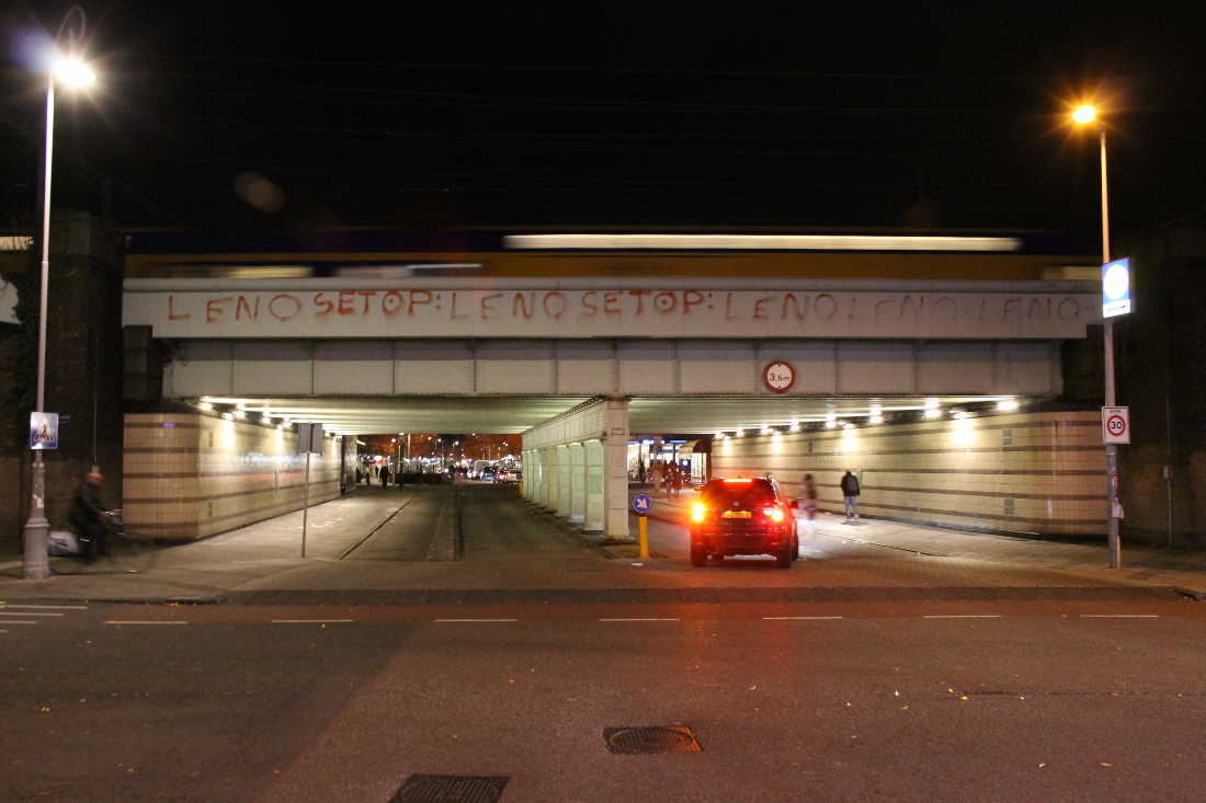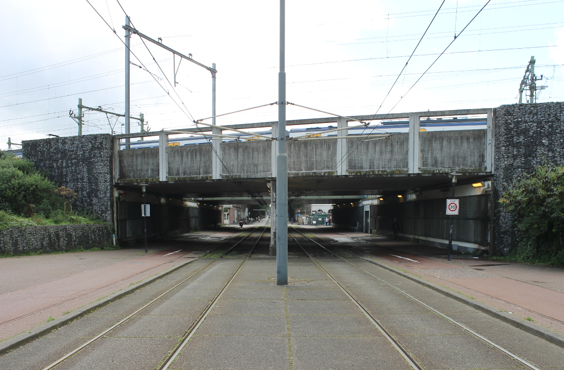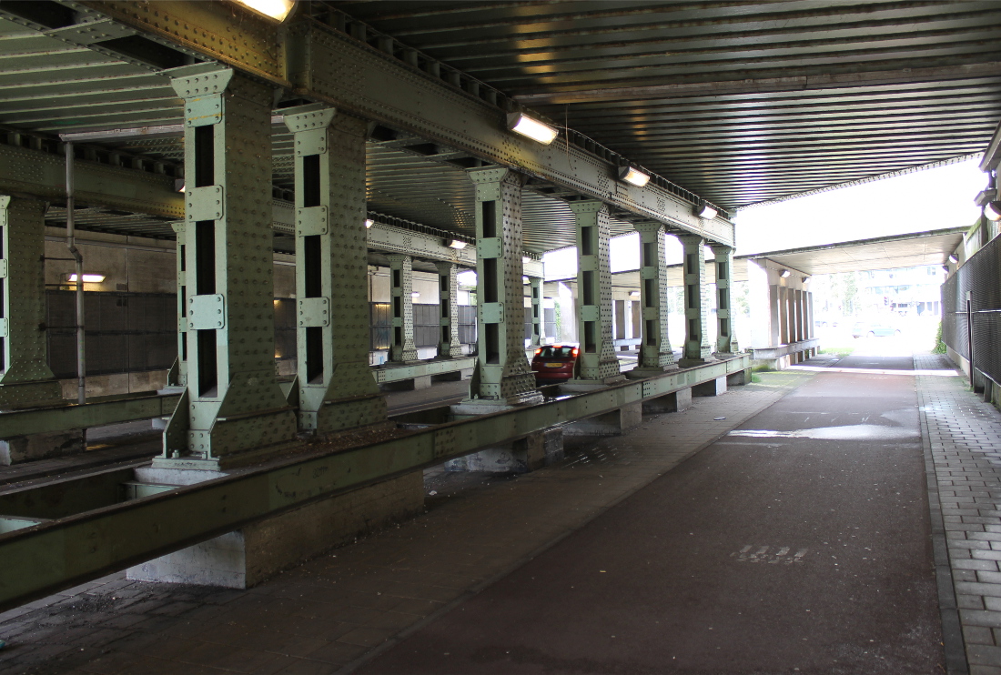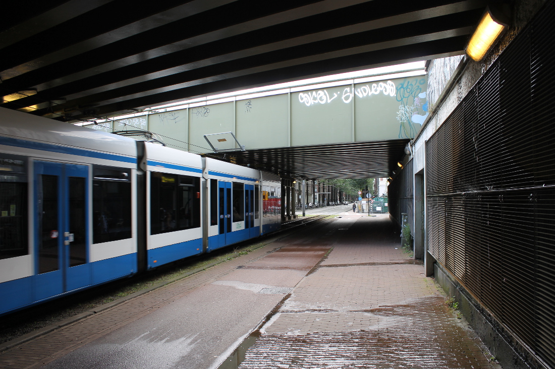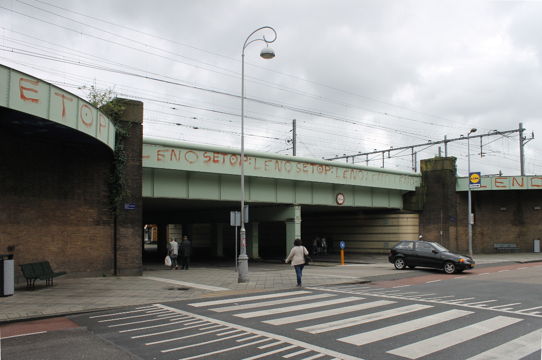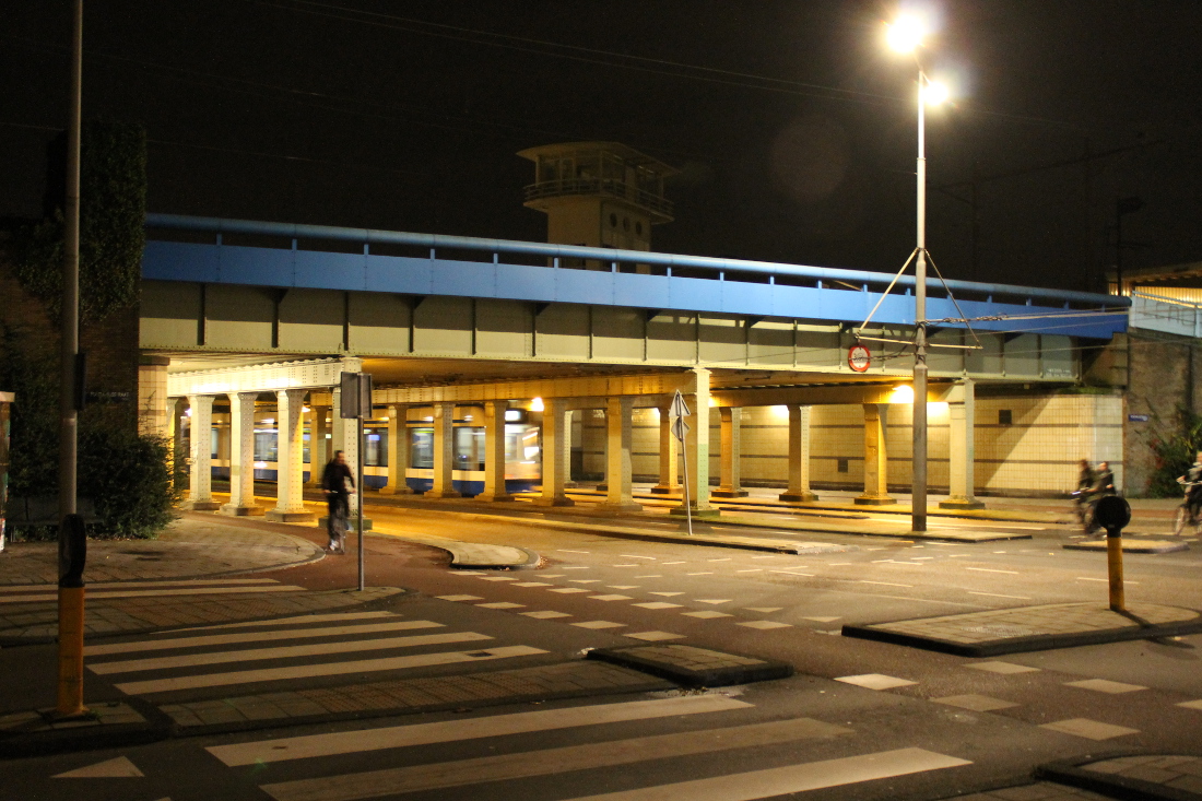 De eerste onderdoorgang in Oost op deze route. Hier was al sinds 1901 een viaduct, waar een tram doorheen kon naar de Indische Buurt. Het oude viaduct werd voor de Spoorwegwerken Oost vervangen door een nieuw met twee doorgangen van elk krap 10 meter. Waar nu de lelijke betonnen pijler is, waren oorspronkelijk stalen kolommen.