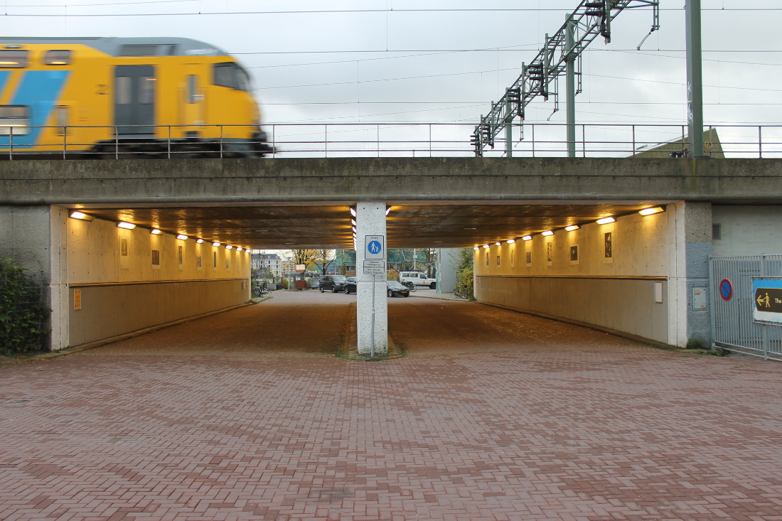 Onderdoorgang met twee openingen van elk 10 meter. Hier zijn de wanden niet (meer?) betegeld. Aan de noordoostkant is in de jaren ’90 een betonnen viaduct toegevoegd.